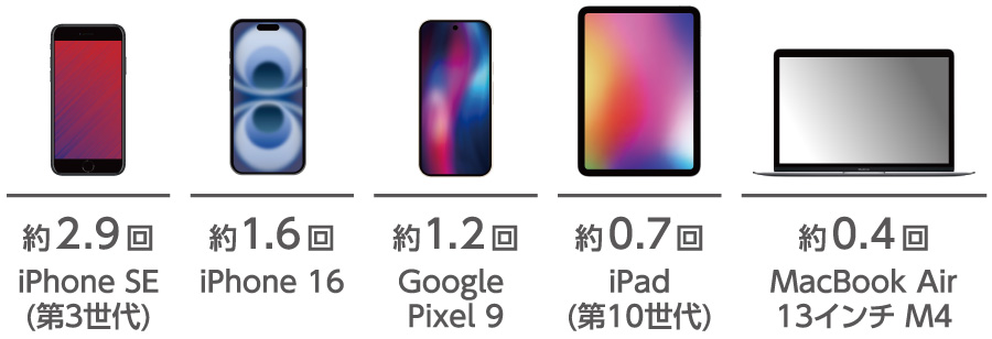 満充電した本製品で電源オフの状態のスマートフォンを充電する際の目安回数です。充電中に電源を入れたり、機器を使用したりしている場合は記載の数値まで充電できない場合があります。