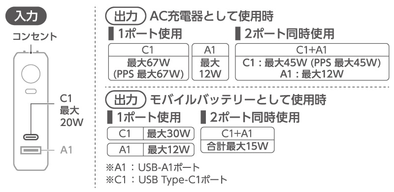 ※1 67W以下のUSB Type-C入力に対応したパソコンに限ります(AC充電器として使用時)。