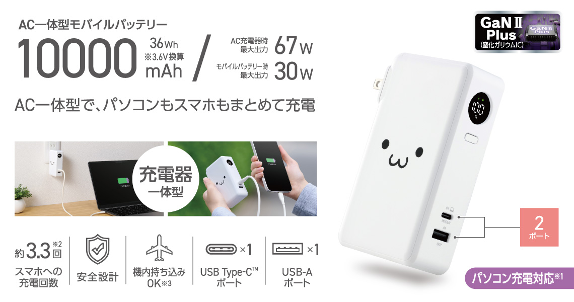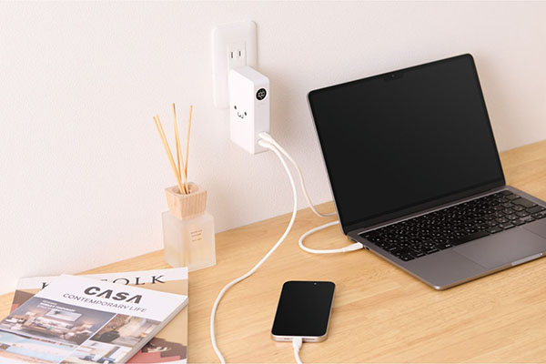 AC充電器として67Wの出力が可能。スマートフォンやタブレットはもちろん、MacBook Airなどのノートパソコンの充電にも使えます。