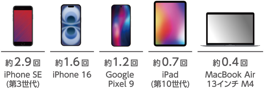 満充電した本製品で電源オフの状態のスマートフォンを充電する際の目安回数です。充電中に電源を入れたり、機器を使用したりしている場合は記載の数値まで充電できない場合があります。