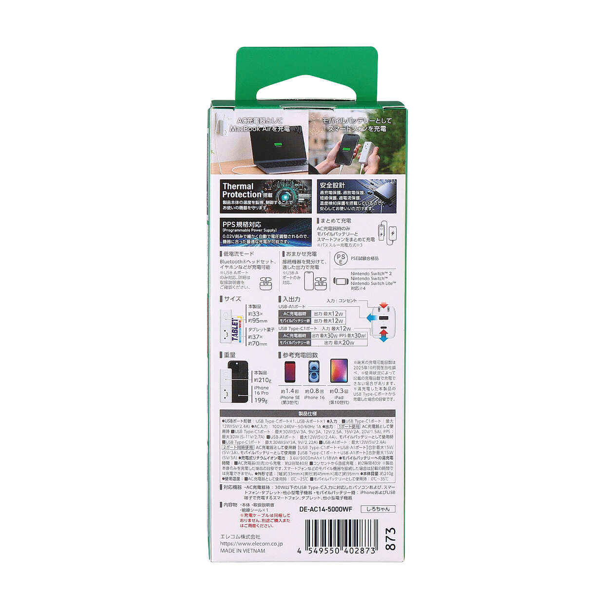 AC充電器としてもモバイルバッテリーとしても使用可能な2in1タイプ!ポーチやポケットにすっぽり収まる手のひらサイズ。2ポート搭載で複数のデバイスを一気に充電できる、AC充電器一体型モバイルバッテリーです。かわいいしろちゃんモデルです。