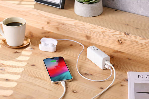 USB Type-C™ポート×1、USB-Aポート×1を搭載。スマートフォンとワイヤレスイヤホンなど、複数のデバイスを接続して一気に充電できます。