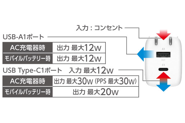 AC充電器として30Wの出力が可能。スマートフォンやタブレットはもちろん、MacBook Airなどのノートパソコンの充電にも使えます。