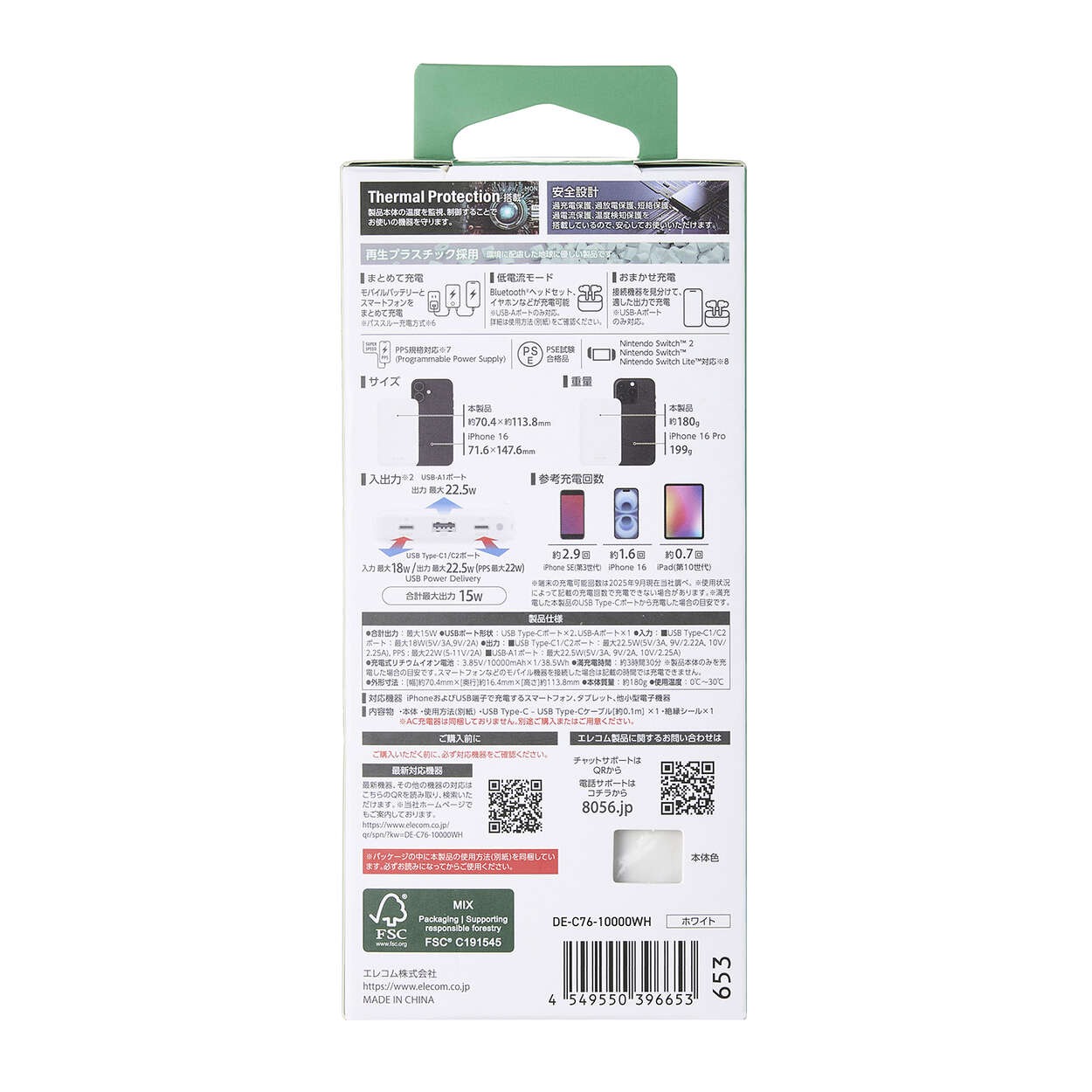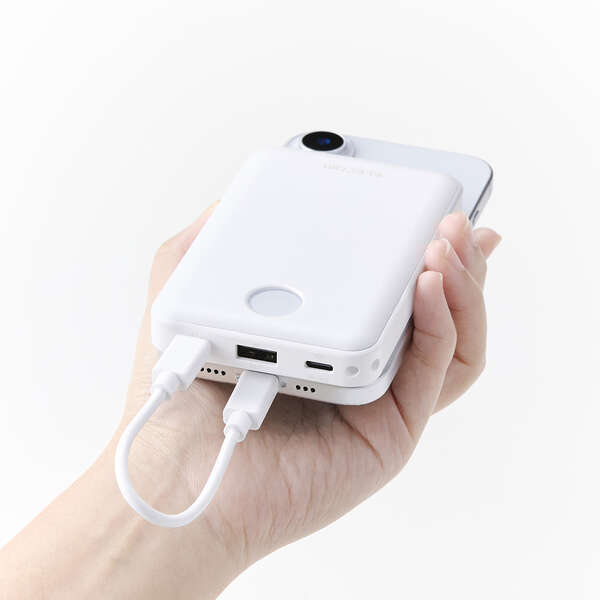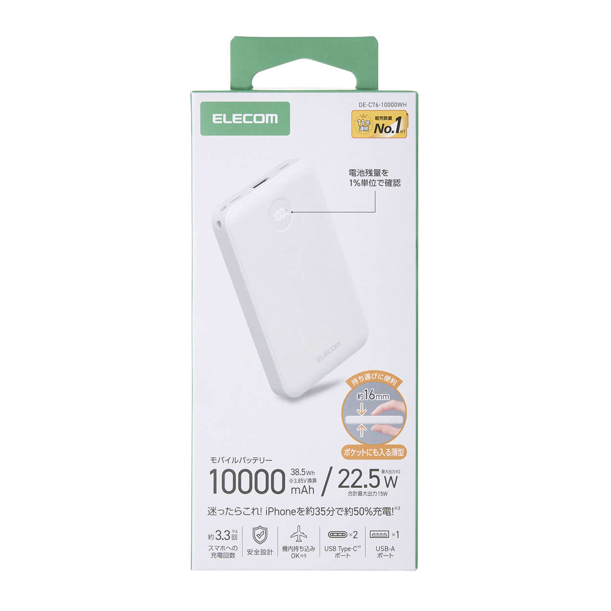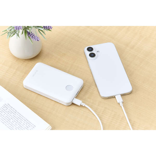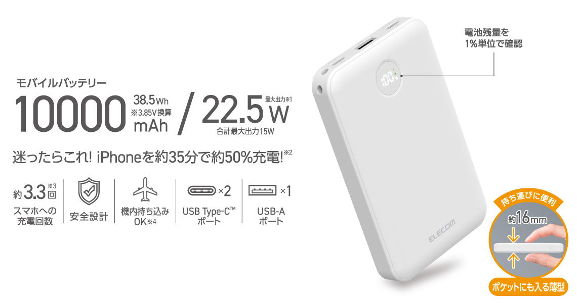厚さ約16mmの手のひらサイズで、持ち運びに便利なモバイルバッテリーです。大容量10000mAhで、外出先でも安心して充電できます。ポーチやポケットにもすっきり収まり、手軽に持ち運び可能です。LEDパネルでバッテリー残量を1%単位で確認しながら使用できます。
