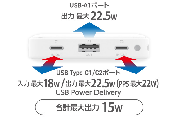 ※USBType-C™1ポート/USB-A1ポートの出力22.5Wは、HUAWEI機器のみに対応しています。