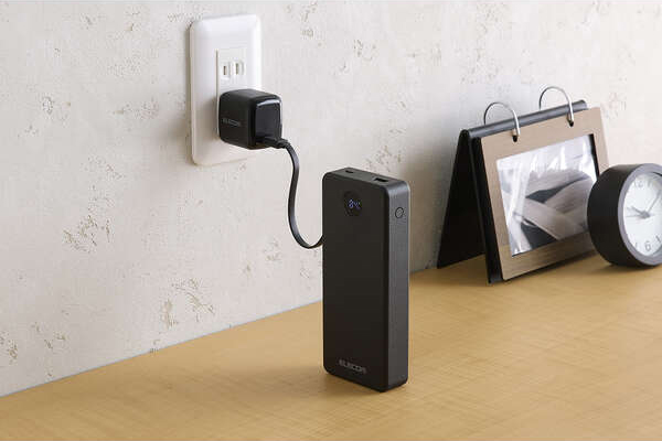 モバイルバッテリーへの充電は一体型USB Type-CケーブルまたはUSB Type-Cポートでできます。