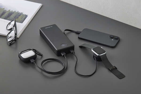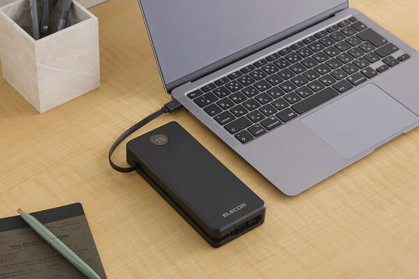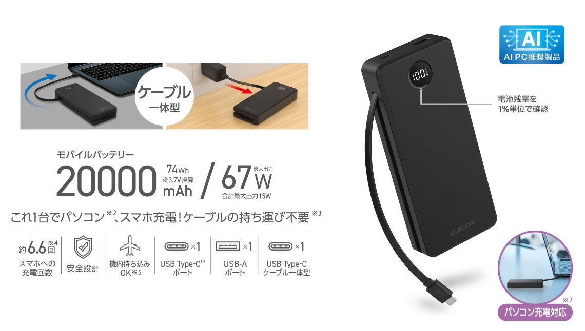 外出先でノートパソコンも充電できる。最大出力67Wでさまざまな機器の充電が可能な、20000mAhのケーブル一体型モバイルバッテリーです。LEDパネルでバッテリー残量を1%単位で確認しながら使えます。