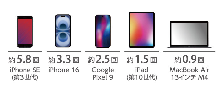 ※ 満充電した本製品で電源オフの状態のスマートフォンを充電する際の目安回数です。充電中に電源を入れたり、機器を使用したりしている場合は記載の数値まで充電できない場合があります。