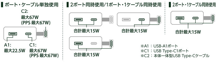 ※ 複数の機器を同時に充電する場合は、1ポート/1ケーブルあたりの出力が低下するため、ご使用の機器によっては充電できない場合があります。