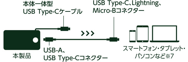 ※7:67W以下のUSB Type-C入力に対応したパソコンに限ります。また、タブレットやパソコンの充電は1台のみに対応しています。複数の機器を同時に充電する場合は充電できないか、充電に時間がかかる場合があります。