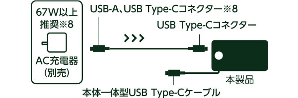 ※8: AC充電器は67W以上を推奨します。67W未満のAC充電器で充電した場合や、USB Type-C - USB-Aケーブルで充電した場合、裏面の製品仕様に記載の時間では満充電にならない場合があります。