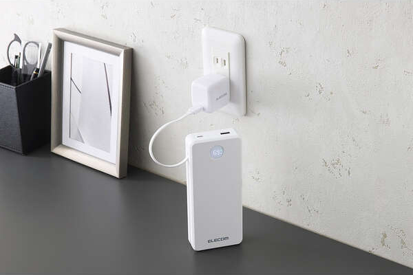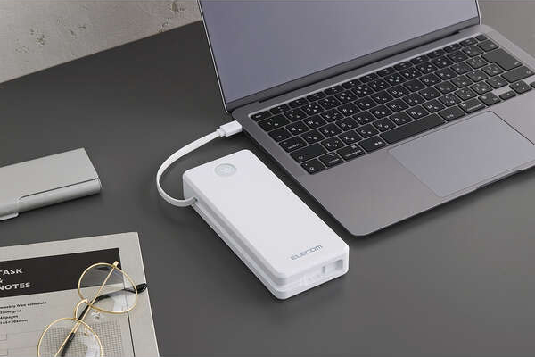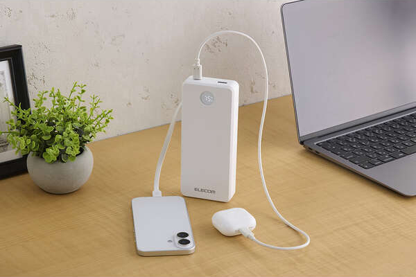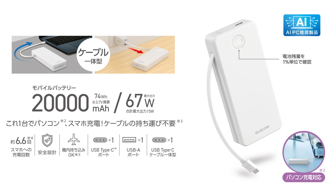 外出先でノートパソコンも充電できる。最大出力67Wでさまざまな機器の充電が可能な、20000mAhのケーブル一体型モバイルバッテリーです。LEDパネルでバッテリー残量を1%単位で確認しながら使えます。