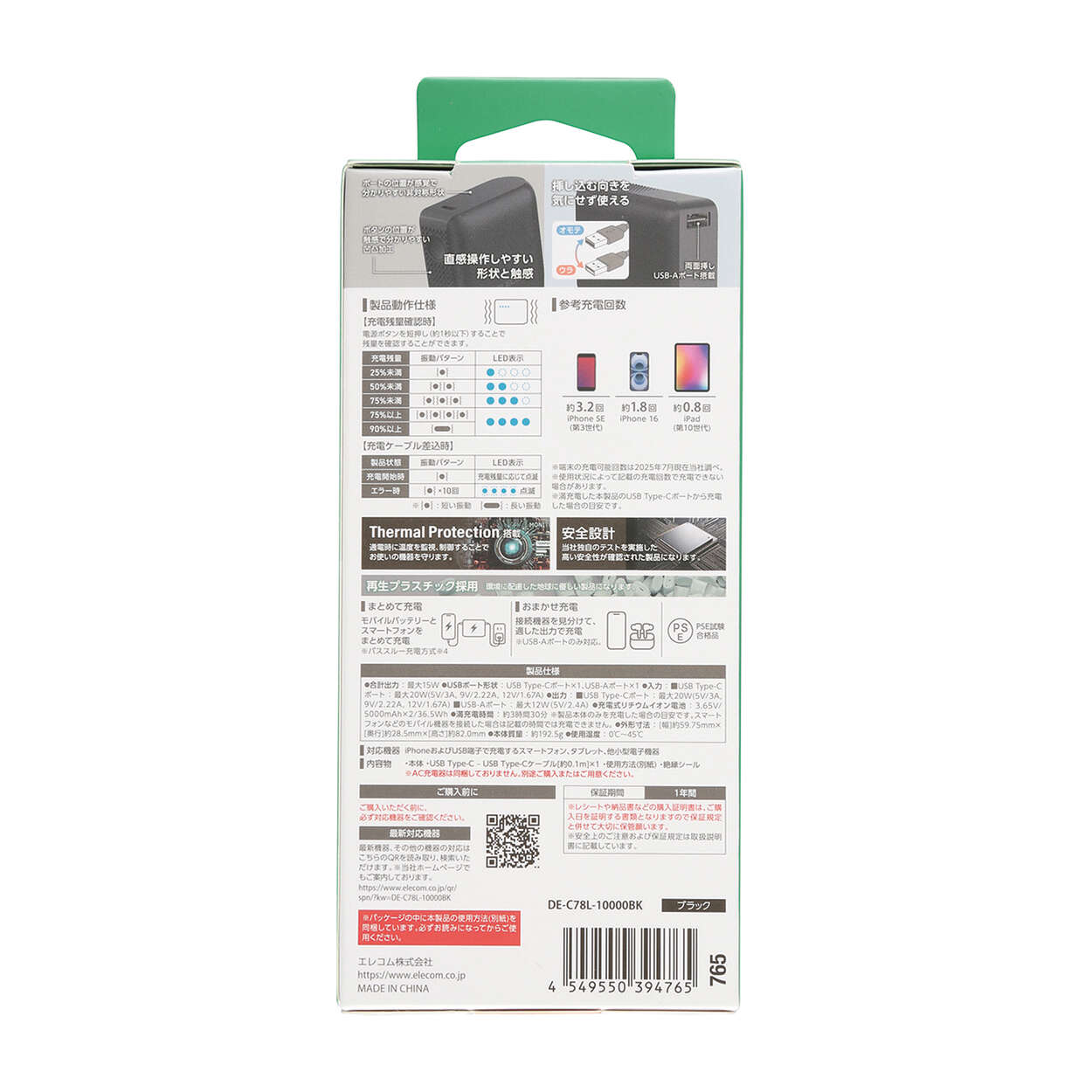 本製品(バッテリー容量10000mAh)で、1800mAhのスマートフォンを約3.3回、3000mAhのスマートフォンを約1.9回充電可能です。