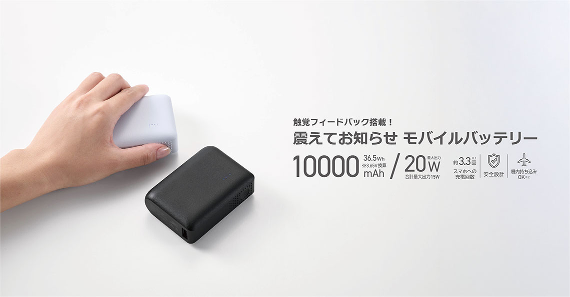 モバイルバッテリーの充電がきちんとできているかどうか、振動でお知らせします。充電開始時はもちろん、ケーブルを挿したのに充電できていない場合も、細かな振動で状況を通知します。