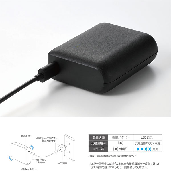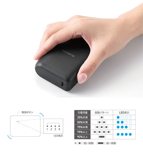 モバイルバッテリーの電池残量を、振動でお知らせ。側面のボタンを押すと、モバイルバッテリーがブルブル震えて残量を5段階で示します。かばんやポケットの中に入った状態でも、触れるだけで電池残量を確認できて便利です。