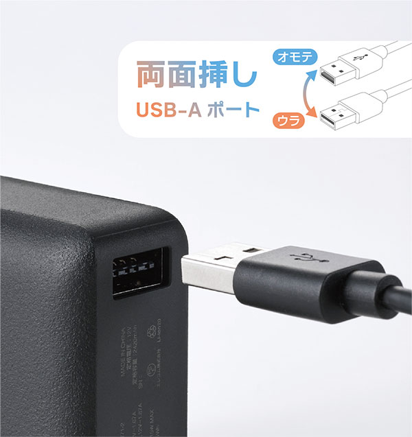 USB-AポートとUSB Type-Cポートを上下に一つずつ搭載しています。USB-Aポートは、上下の向きを気にせず挿せる両面挿しタイプです。