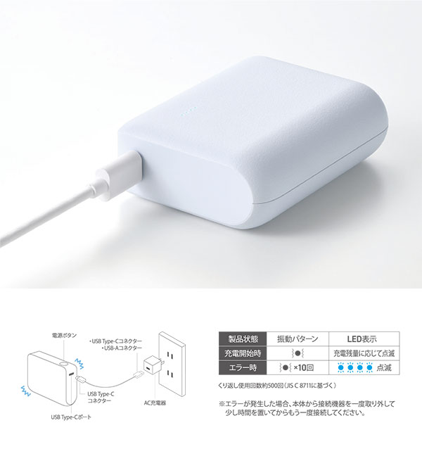 モバイルバッテリーの電池残量を、振動でお知らせ。側面のボタンを押すと、モバイルバッテリーがブルブル震えて残量を5段階で示します。かばんやポケットの中に入った状態でも、触れるだけで電池残量を確認できて便利です。