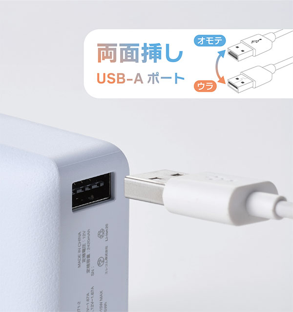 USB-AポートとUSB Type-Cポートを上下に一つずつ搭載しています。USB-Aポートは、上下の向きを気にせず挿せる両面挿しタイプです。