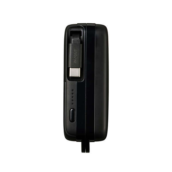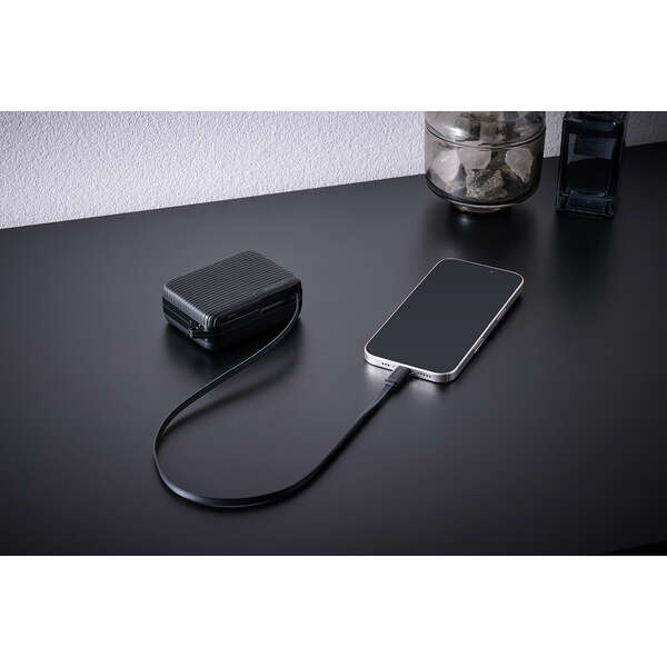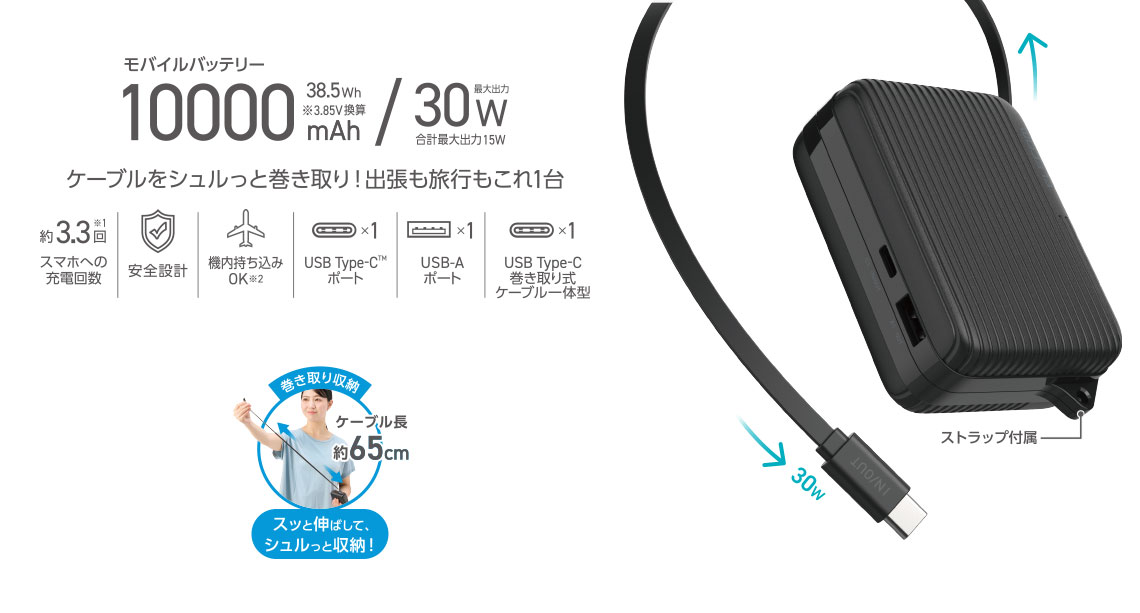 スッと伸ばして、くるっと収納!本体一体型の巻き取り式USB Type-C(TM)ケーブルを備えた、キャリーケースデザインのモバイルバッテリーです。最大出力30Wなので、スマートフォンやタブレットはもちろん、ノートパソコンの充電も可能です。容量10000mAhで外出先でも安心して充電できます。ケーブルを持ち忘れる心配がなく、必要な長さに調節して使用できます。