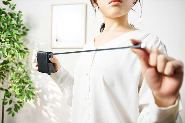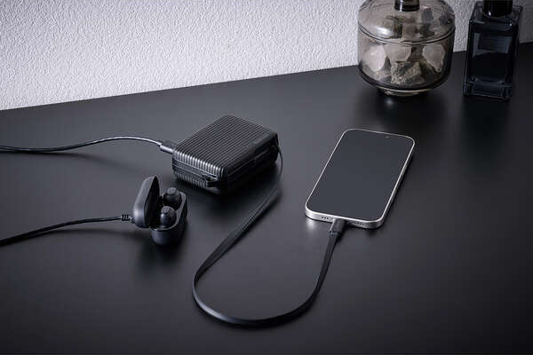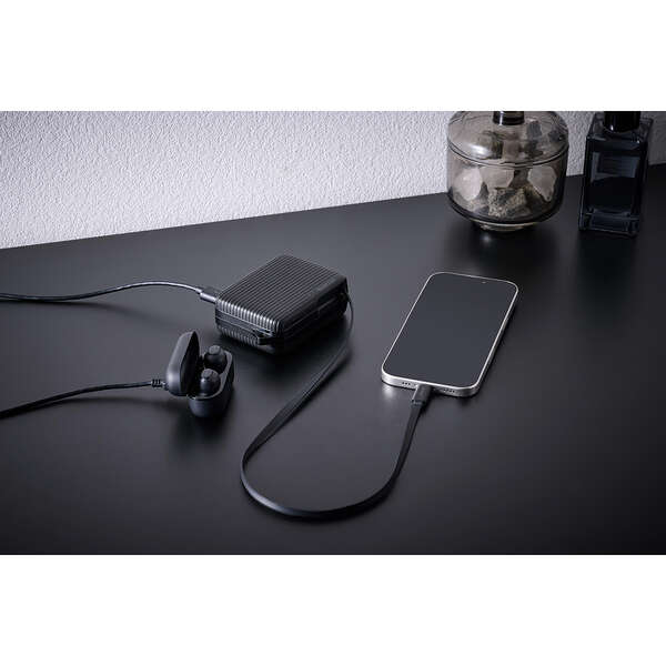 本体一体型ケーブルは巻き取り式のため、使用後はケーブルを巻き取って、すっきりと収納可能。ケーブルの長さは約65cmあり、必要な分だけ引き出して充電しながらスマートフォンを使用できます。