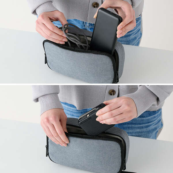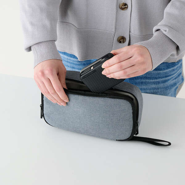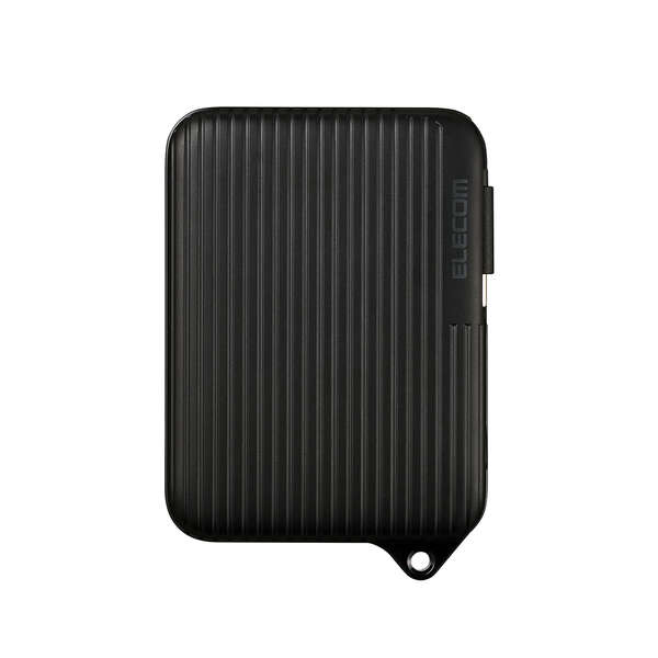 旅行や出張にぴったりのキャリーケース風デザインが映える、容量10000mAhのモバイルバッテリーです。本体一体型の巻き取り式USB Type-C™ケーブルを備えています。