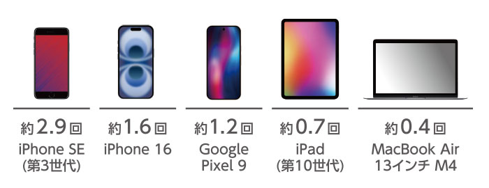 ※満充電した本製品で電源オフの状態のスマートフォンを充電する際の目安回数です。充電中に電源を入れたり、機器を使用したりしている場合は記載の数値まで充電できない場合があります。