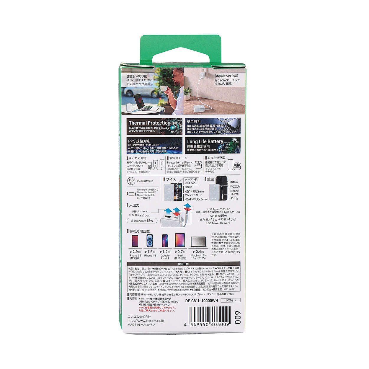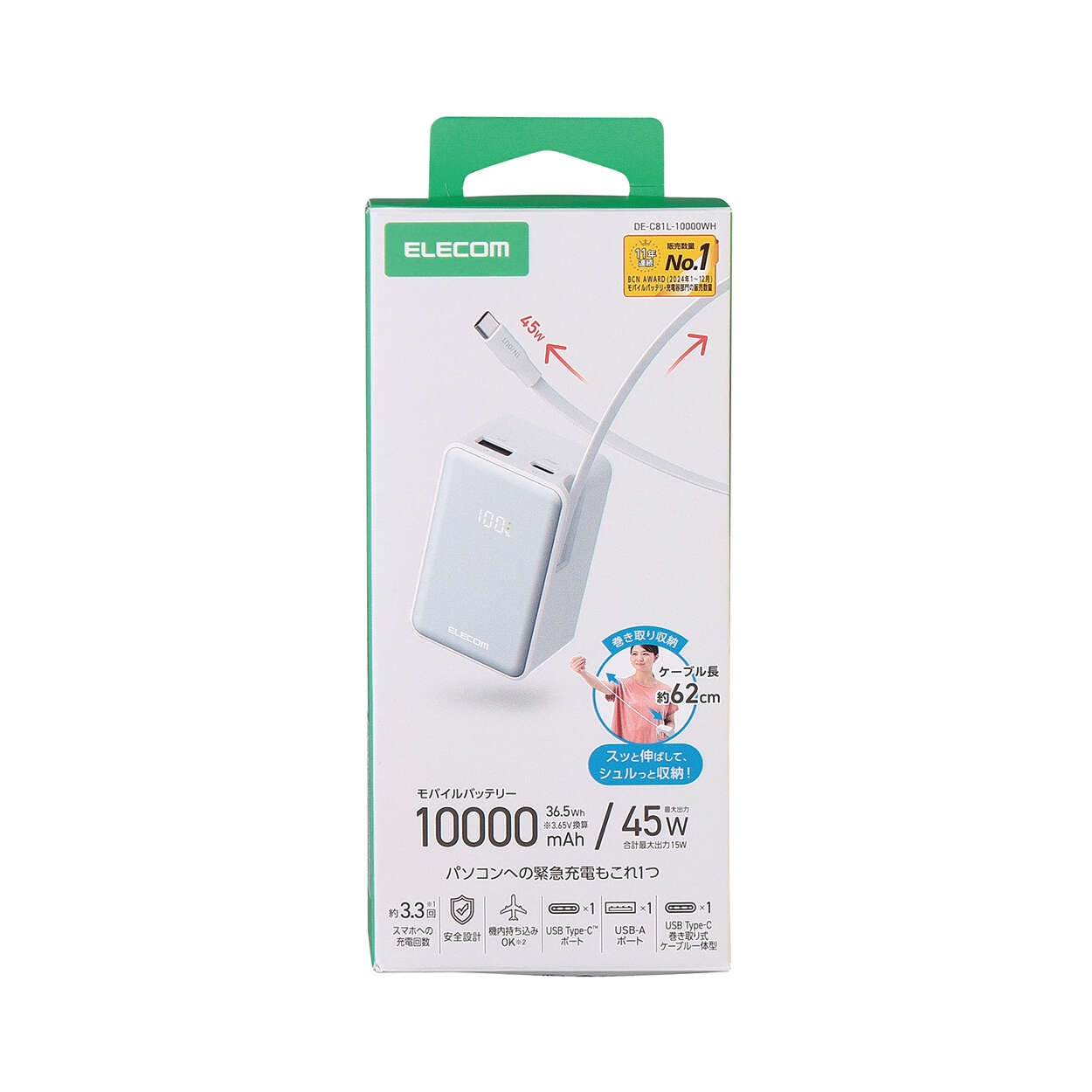 スッと伸ばして、くるっと収納!持ち運びに便利な本体一体型の巻き取り式USB Type-C(TM)ケーブルを備えたモバイルバッテリーです。最大出力45Wなので、スマートフォンやタブレットはもちろん、ノートパソコンの充電も可能。容量10000mAhで外出先でも安心して充電できます。ケーブルを持ち忘れる心配がなく、必要な長さに調節して使用できます。
