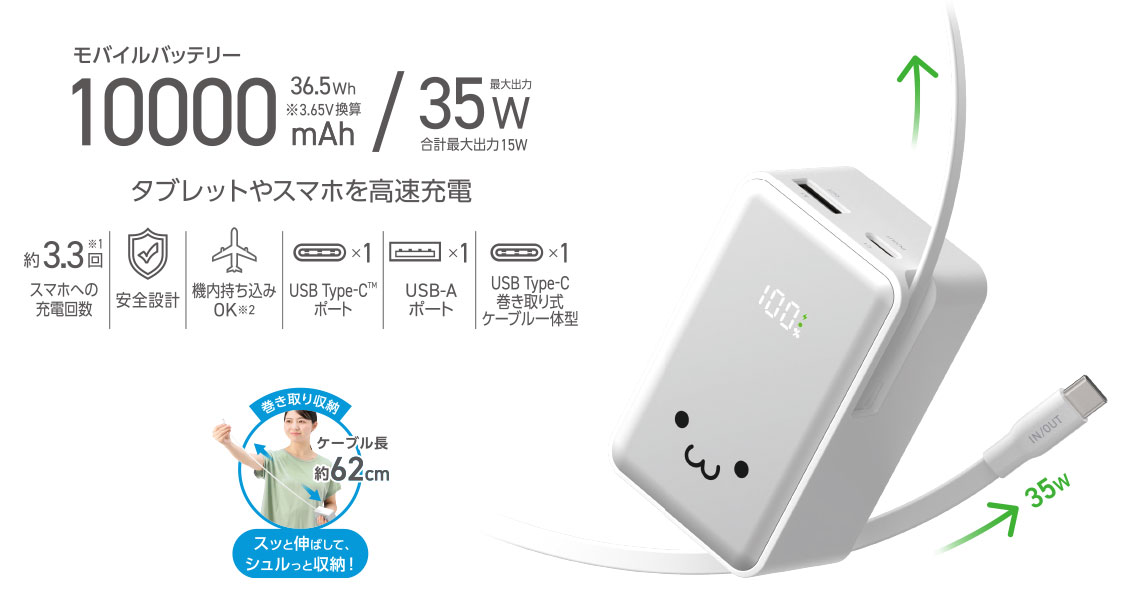 スッと伸ばして、くるっと収納!持ち運びに便利な本体一体型の巻き取り式USB Type-C(TM)ケーブルを備えたモバイルバッテリーです。最大出力35Wなので、スマートフォンやタブレットはもちろん、ノートパソコンの充電も可能。容量10000mAhで外出先でも安心して充電できます。ケーブルを持ち忘れる心配がなく、必要な長さに調節して使用できます。かわいいしろちゃんモデルです。