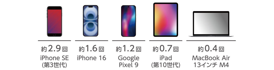 ※満充電した本製品で電源オフの状態のスマートフォンを充電する際の目安回数です。充電中に電源を入れたり、機器を使用したりしている場合は記載の数値まで充電できない場合があります。