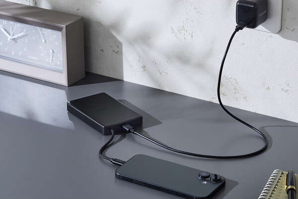 AC充電器のポート不足を解消。パススルー充電に対応しているため、バッテリー本体の電池を介さずにスマートフォンへ直接給電でき、電池の劣化を抑えられます。