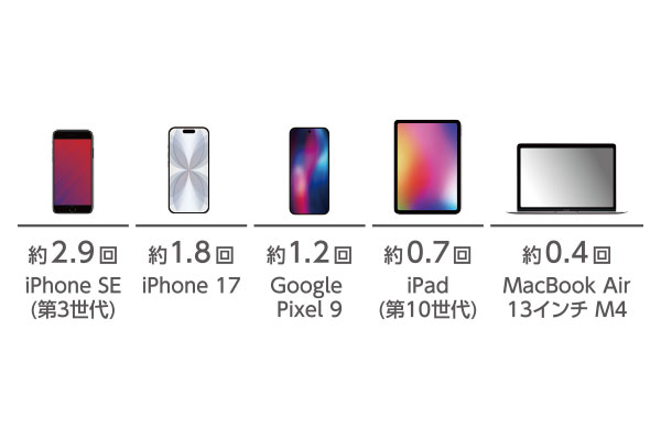 満充電した本製品で電源オフの状態のスマートフォンを充電する際の目安回数です。充電中に電源を入れたり、機器を使用したりしている場合は記載の数値まで充電できない場合があります。