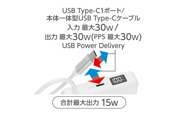 USB Type-C一体型ケーブルまたはUSB Type-Cポートの単独使用でUSB Power Deliveryの最大30W出力が可能。スマートフォンやタブレットはもちろん、Macbook Airなどのノートパソコンも充電できます。