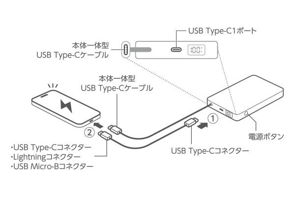 ケーブルを別途持ち運ばなくても、スマートフォンへの充電はもちろんのこと、バッテリーへの充電もできます。