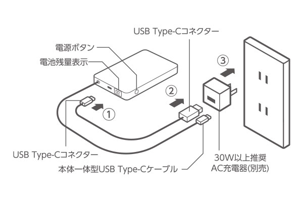 AC充電器は30W以上を推奨します。30W未満のAC充電器で充電した場合や、USB Type-C - USB-Aケーブルで充電した場合、パッケージやHPに記載の時間では満充電にならない場合があります。
