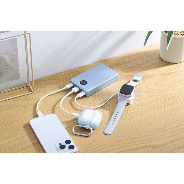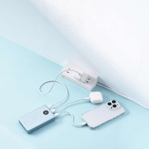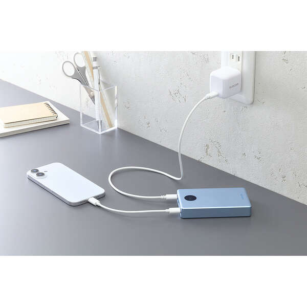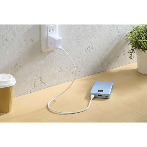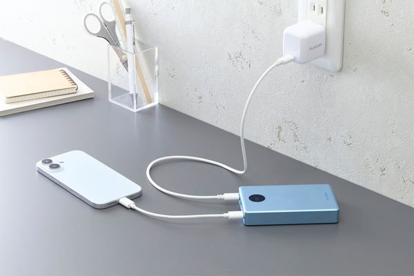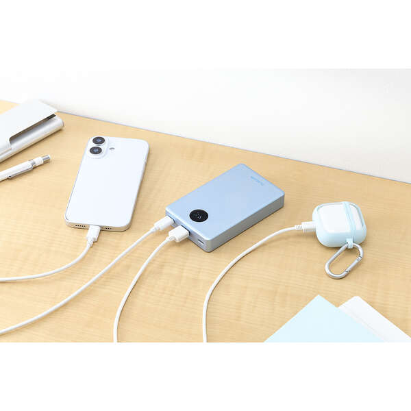 AC充電器のポート不足を解消。パススルー充電に対応しているため、バッテリー本体の電池を介さずにスマートフォンへ直接給電でき、電池の劣化を抑えられます。