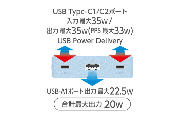 高性能ICが接続機器を自動で見分けて最適な出力で最速に充電できる“おまかせ充電”に対応しています。
