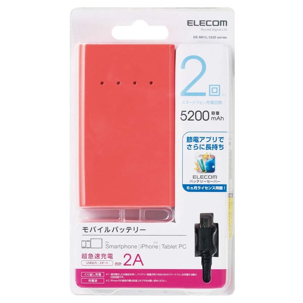 スマートフォンを約2回(※)充電できる!2ポート搭載・合計2A出力可能な高出力タイプのスマートフォン用モバイルバッテリー。※満充電をした本製品を用い、バッテリー容量が約1400mAhのスマートフォンを充電する際の目安回数です。