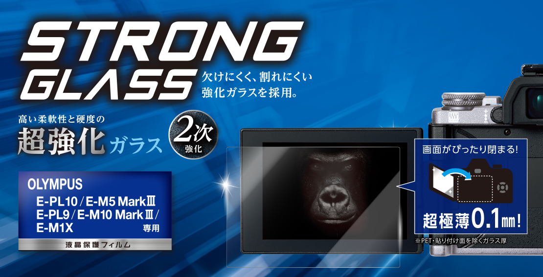 デジタルカメラの液晶モニタを傷や汚れから保護する超極薄0.1mmガラス厚のGorilla(R)ガラスを採用したバリアングル式液晶モニタ対応の高光沢液晶保護ガラスです。