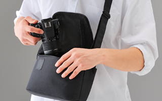 一眼レフカメラと交換レンズひとつが収納可能なカメラショルダーバッグ“normas(ノーマス)”です。