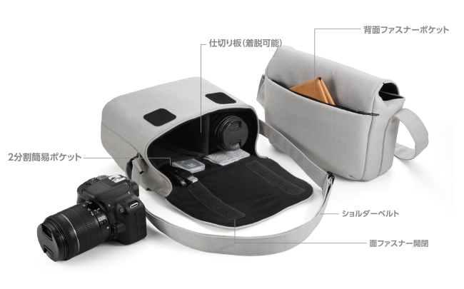 一眼レフカメラと交換レンズひとつが収納可能なカメラショルダーバッグ“normas(ノーマス)”です。