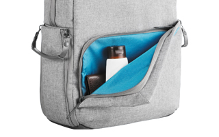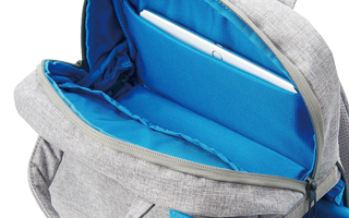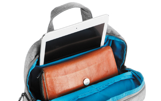 9.7インチまでのタブレットが収納できる専用ポケットと、財布やペットボトルなどの収納に便利な小物収納スペースを配置しています。