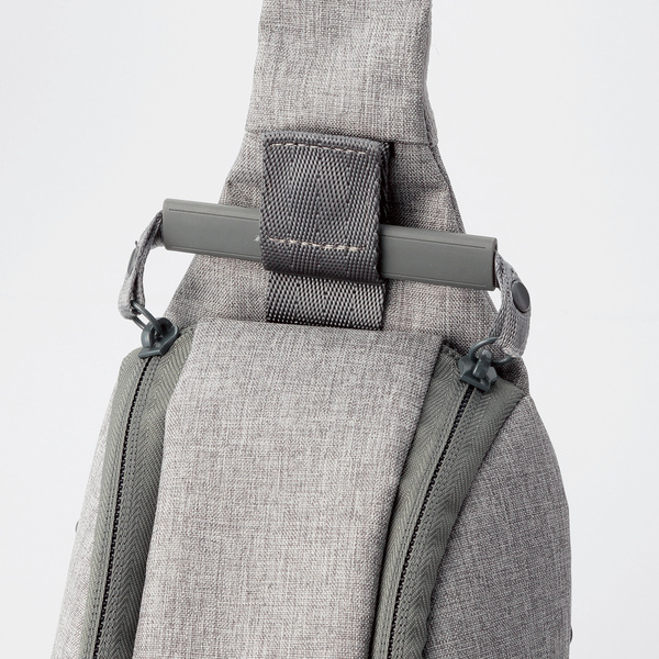 ダブルファスナーのハンドルをまとめて固定でき、誤開閉を防ぐ簡易ロックボタンがついています。