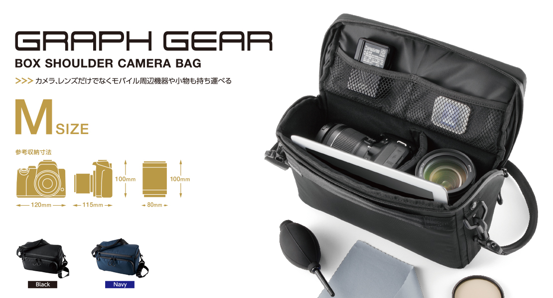 ミラーレス一眼レフカメラ/デジタル一眼レフカメラだけでなくモバイル周辺機器なども持ち運べるBOXタイプショルダーカメラバッグMサイズ“GRAPH GEAR”モデルです。