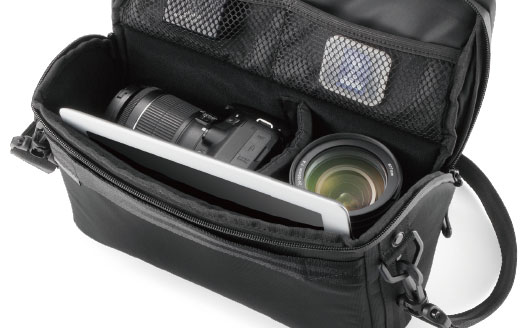 メイン収納スペースにはデジタル一眼レフカメラ、交換用レンズ、交換用バッテリー、SDカード、9.7inchのタブレット端末が収納できます。