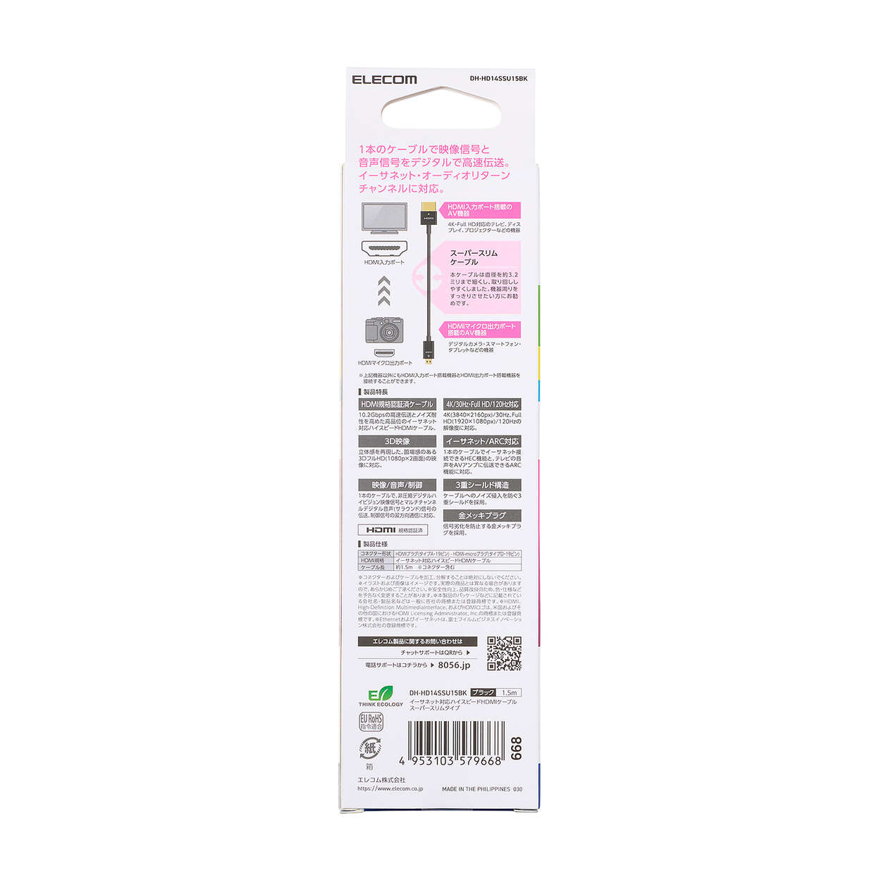 ケーブル直径約3.2mmで取り回しがしやすく、すっきり配線できる、スーパースリムタイプのイーサネット対応ハイスピードHDMIケーブルです。HIGH SPEED with Ethernet認証済み製品です。