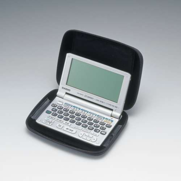 セミハードタイプ電子辞書ケース。 粘着シートで電子辞書本体をケースに装着して使用できます。 メディアカードなどを収納するためのインナーポケットも装備!
