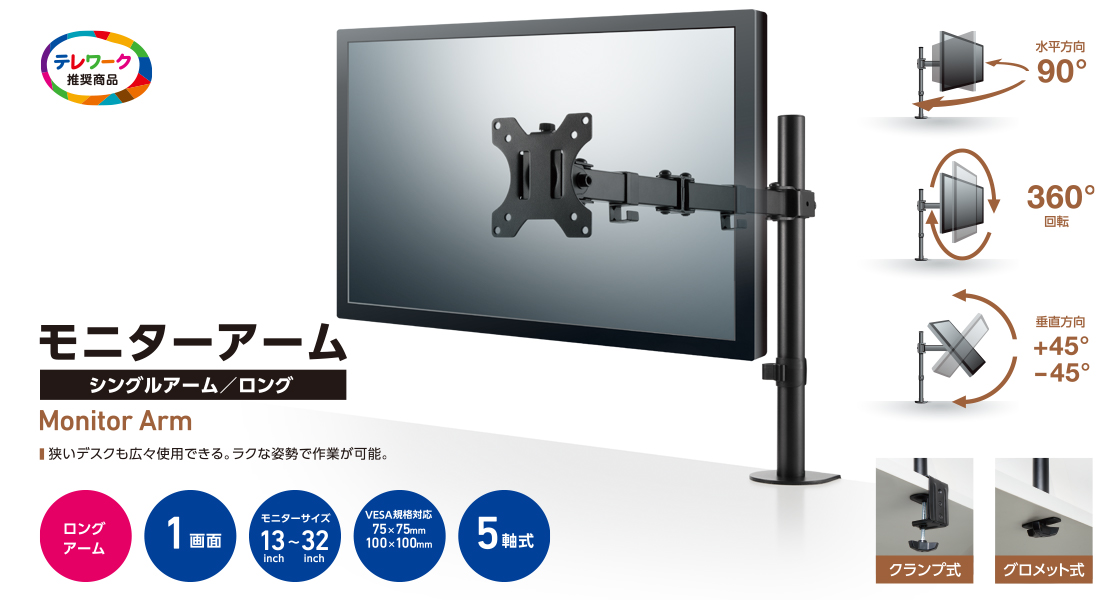 VESA規格(75×75mm、100×100mm)に準拠したモニターに対応しています。
