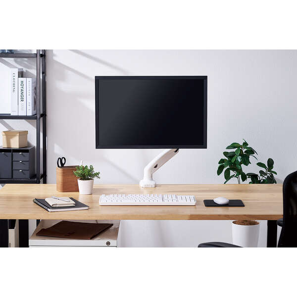 モニターの位置を自由に調整でき、デスクのスペースを有効活用!17~32インチサイズのモニターに対応するガススプリング式のシングルモニターアームです。