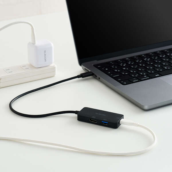 USB Type-C™プラグでパソコンに接続し、パソコンを充電しながらUSB 5Gbps(USB3.2(Gen1))機器やHDMI®ケーブルを接続できるドッキングステーションです。