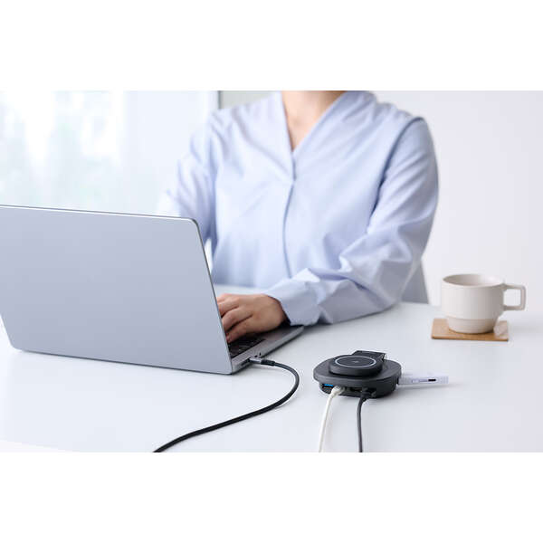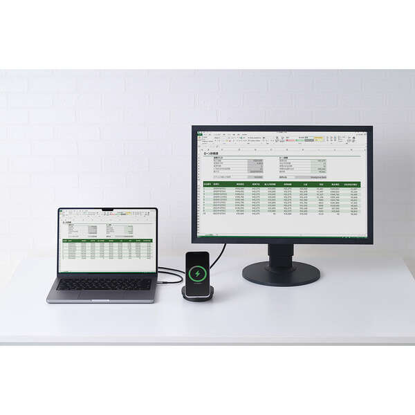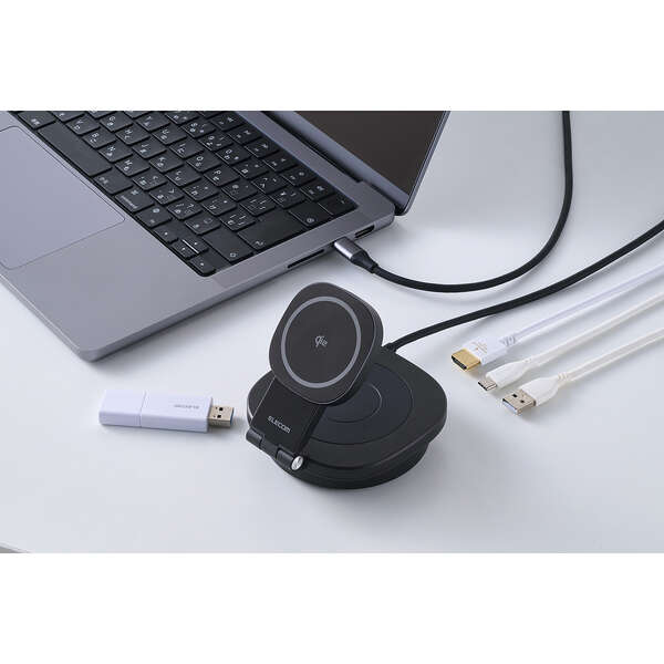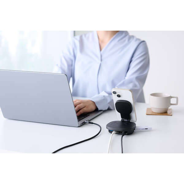 スマートフォンやAirPodsの充電、パソコンの充電、周辺機器の接続をこの1台に集約。Qi2対応ワイヤレス充電スタンドを備えた4in1ドッキングステーションです。デスク周りの機器をまとめることで、ワークスペースが整理され作業効率が向上します。安定したスタンド設計でスマートフォンをしっかり固定し、作業中でも見やすい最適な角度を保ちます。また折りたたんでコンパクトに収納できます。